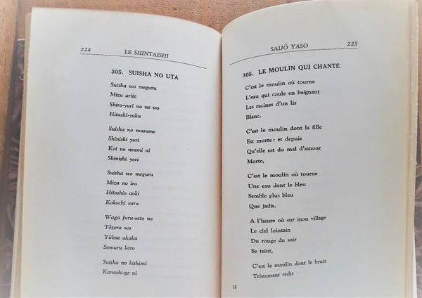 - Bijzonderheden: 1935, 267 blz., geïllustreerd (4 frontispice portretten), formaat 15x23,5x3 cm., half-segrijnlederen band met kleine hoekjes, rug met vergulde titels en vignetten, gemarmerde platten. Verzameling van 306 gedichten ingedeeld naar genre. Franse vertaling naast de Japanse tekst in romaji transcriptie. Mooi en aantrekkelijk werk
